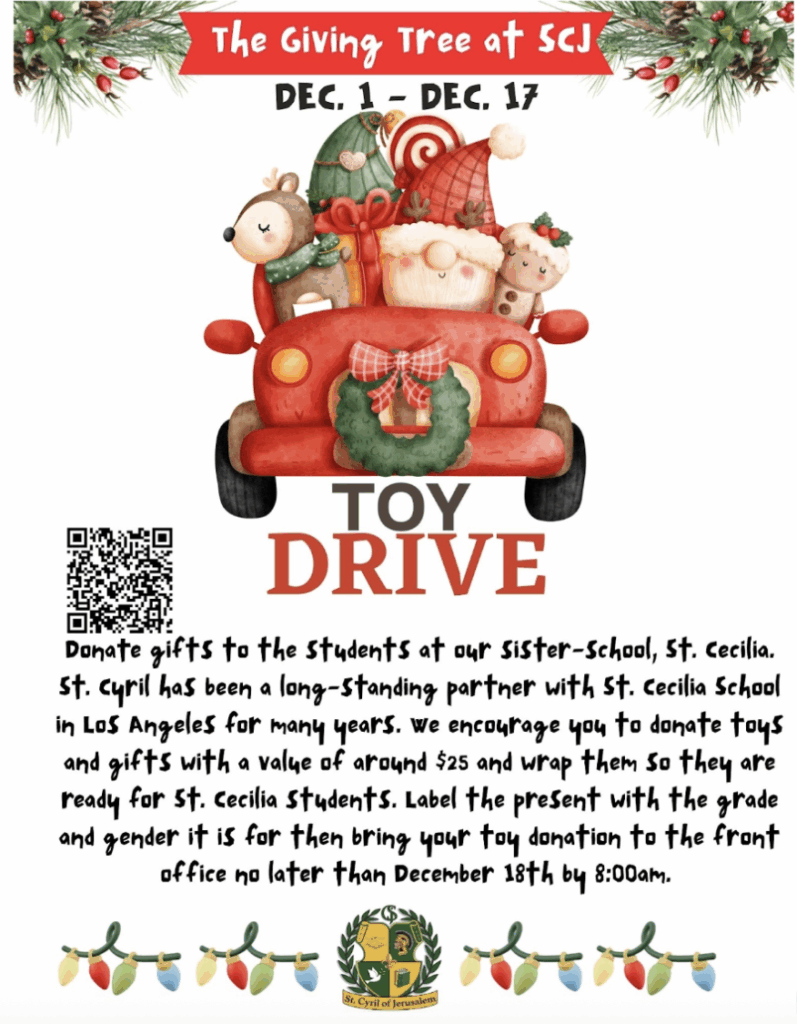 As we approach the Christmas season, the time has come again to open our hearts to giving. St. Cyril has been a long-standing partner with St. Cecilia School in Los Angeles for many years. Please help us in donating gifts to the boys and girls of St. Cecilia School once again this Christmas! We encourage you to donate toys and gifts with a value of around $25 and wrap them so they are ready for St. Cecilia students in December. Label the present with the grade and gender it is for and bring your toy donation to the front office no later than December 18th by 8:00am.